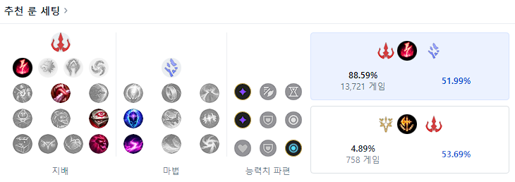 핵심 룬으론 지배에 감전을 들어주시고, 하위 룬에는 피의 맛, 사냥의 증표, 궁극의 사냥꾼을 들어주세요.